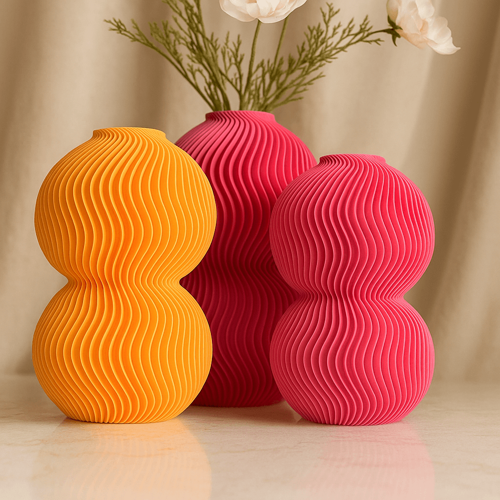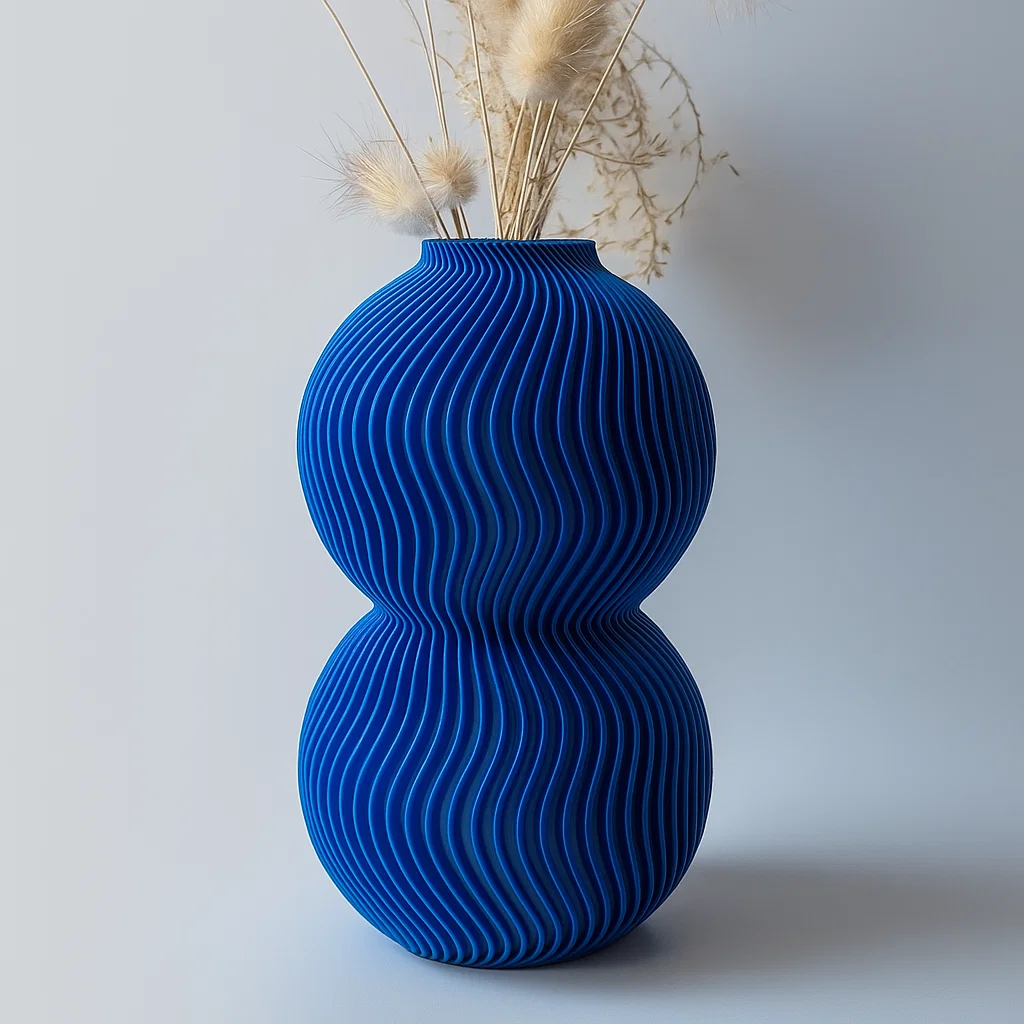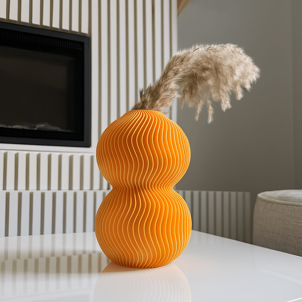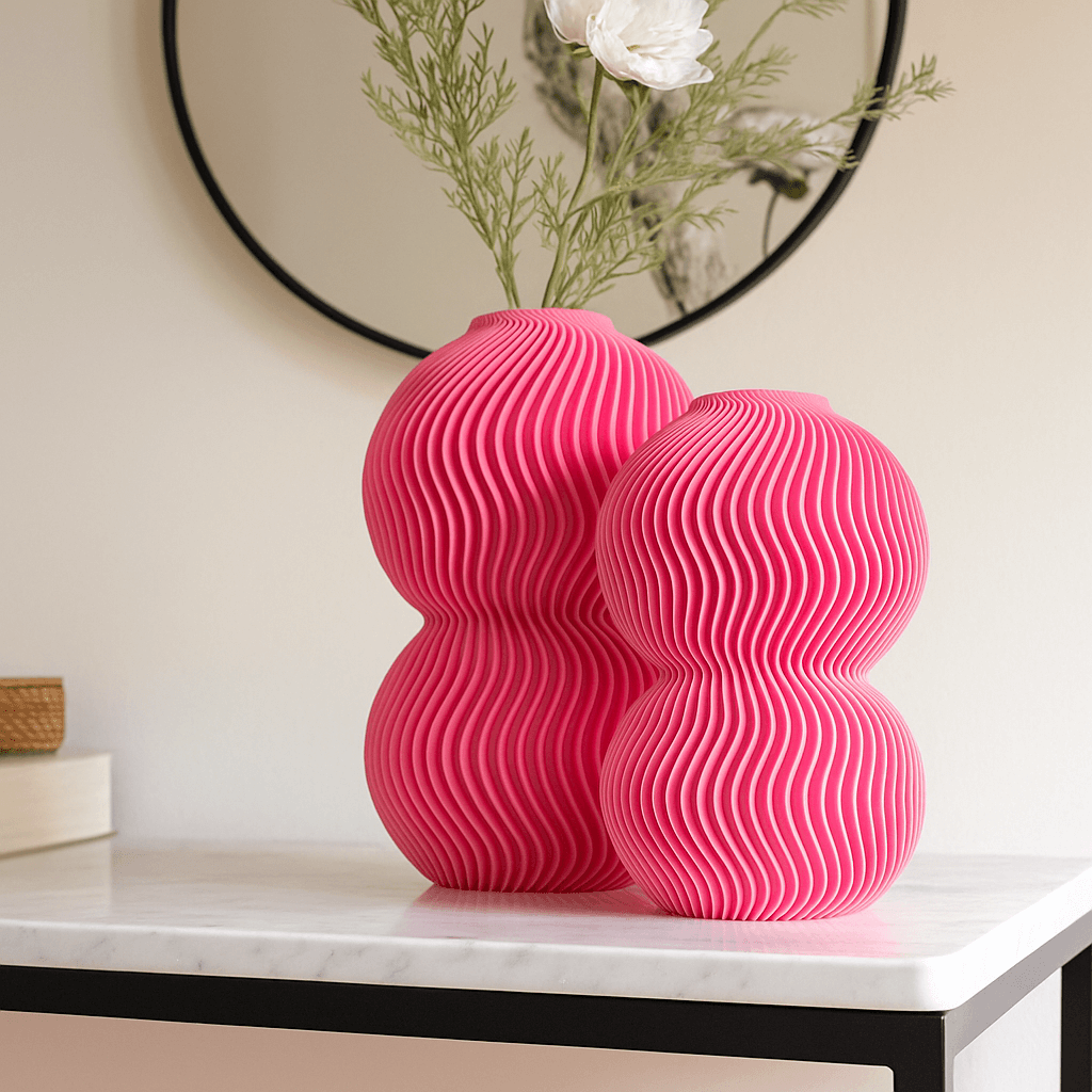 Crafted using eco-friendly, plant-based PLA and 3D-printed for precision, this vase features two globe forms stacked in harmony and wrapped in rhythmic ripple lines. The result? A tactile and visually stunning object that pairs beautifully with dried florals or stands powerfully on its own.