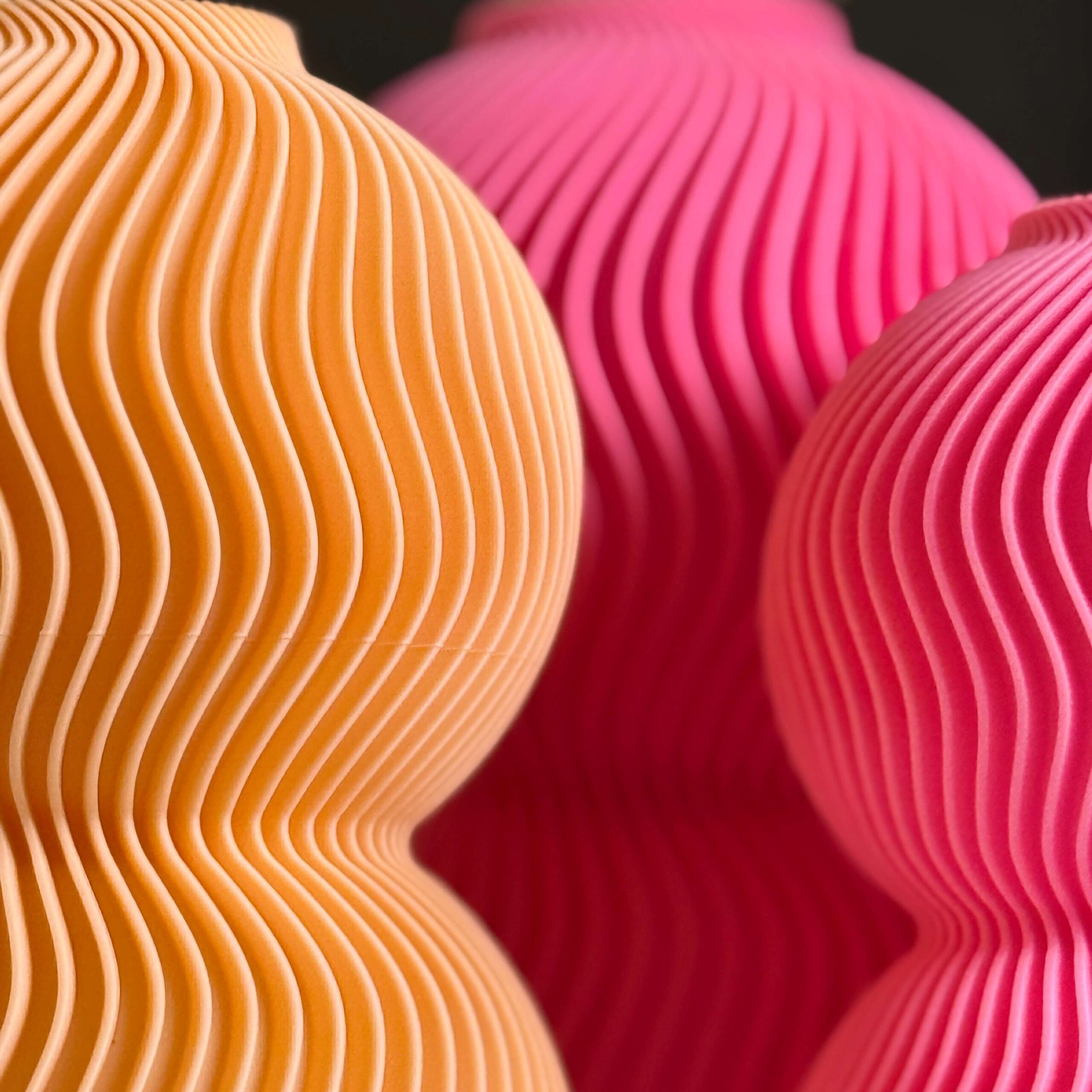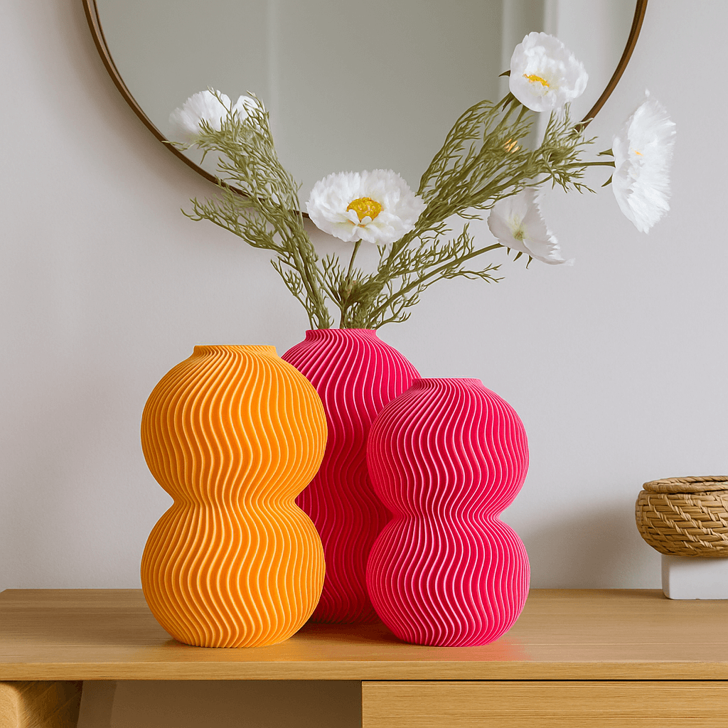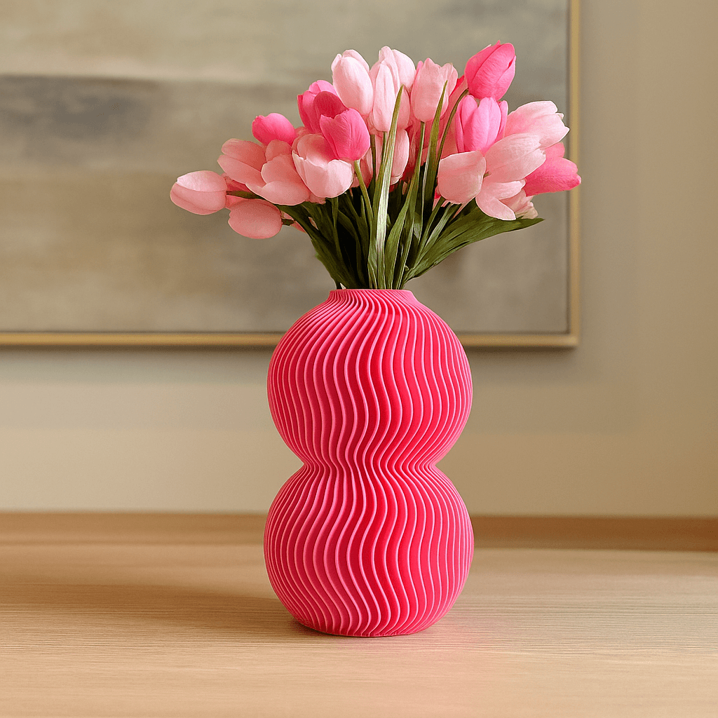 Crafted using eco-friendly, plant-based PLA and 3D-printed for precision, this vase features two globe forms stacked in harmony and wrapped in rhythmic ripple lines. The result? A tactile and visually stunning object that pairs beautifully with dried florals or stands powerfully on its own.